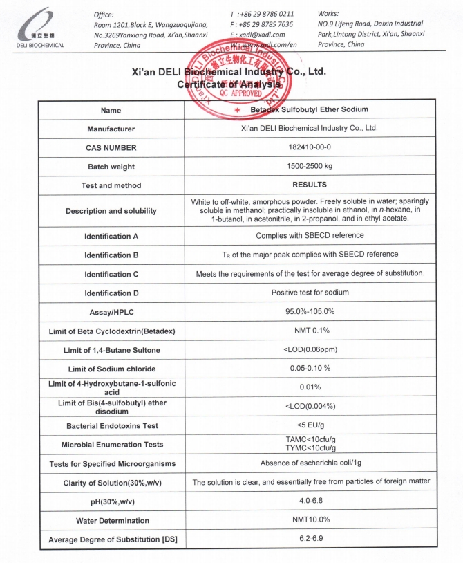 Dieses Sulfobutylether-Beta-Cyclodextrin-Natrium in Injektionsqualität wird unter einem umfassenden Qualitätsmanagementsystem hergestellt. Wichtige Qualitätsmerkmale wie Identifizierung, Analyse, durchschnittlicher Substitutionsgrad, Restverunreinigungen, Endotoxingehalt und mikrobielle Grenzwerte werden streng kontrolliert.